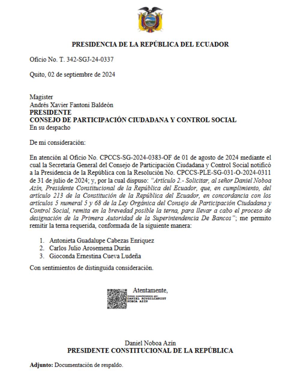Extracto: Envía al Consejo de Participación Ciudadana y Control Social (CPCCS) la terna para designación de la Primera Autoridad de la Superintendencia de Bancos. La terna está conformada por Antonieta Guadalupe Cabezas Durán, actual Superintendente de Bancos; Carlos Julio Arosemena Durán, ex Gerente General del BIESS; y, Gioconda Ernestina Cueva Ludeña, experta en supervisión INSS en la Superintendencia de Bancos. El proceso para la designación inicia con la verificación de cumplimiento de requisitos e inhabilidades, quienes superen esta etapa podrán ser objeto de impugnación de sus candidaturas por parte de la ciudadanía; y, en caso de no ser admitida la impugnación, presentarán sus planes de trabajo ante el Pleno del CPCCS previo a la designación.