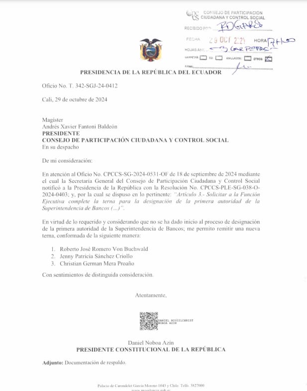 Extracto: Envía al Consejo de Participación Ciudadana y Control Social (CPCCS) la terna para designación de la Primera Autoridad de la Superintendencia de Bancos. La terna está conformada por Roberto Romero Von Buchwald; Jenny Patricia Sánchez Criollo; y, Christian Germán Mera Proaño. El proceso para la designación inicia con la verificación de cumplimiento de requisitos e inhabilidades, quienes superen esta etapa podrán ser objeto de impugnación de sus candidaturas por parte de la ciudadanía; y, en caso de no ser admitida la impugnación, presentarán sus planes de trabajo ante el Pleno del CPCCS previo a la designación.